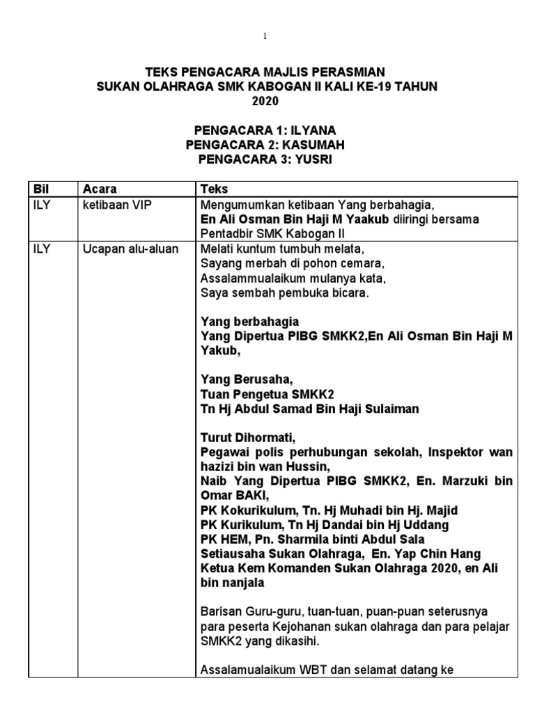 Teks ucapan pengacara majlis malam kebudayaan galau id. Contoh teks pengacara majlis majlis perkahwinan adha & azwan. Teks pengacara majlis perasmian kem motivasi t6 2016. Teks ucapan majlis persaraan mp3 & mp4. Skrip pengacara majlis perasmian bangunan sk jijan 2011. Teks ucapan perasmian speakers corner yang berbahagia. Teks ucapan majlis penyerahan slip keputusan spm 2015. Teks majlis kuarter master teks ucapan majlis kuarter master. Teks ucapan majlis penetapan target. Teks ucapan majlis pelancaran transformasi pendidikan vokasional. Savesave teks ucapan majlis perasmian penutup for later. Teks ucapandatuk haji hajiji haji noor,menteri kerajaan tempatan dan perumahan sempena meraikan majlisperpisahan puan p.s. Terima kasih kepada saudara/i pengerusi majlis.