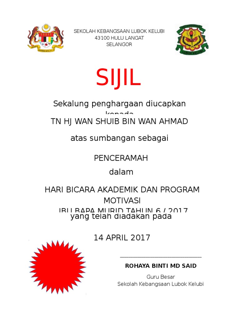 Contoh sijil penghargaan kepada penceramah. Check spelling or type a new query. Maybe you would like to learn more about one of these? We did not find results for: